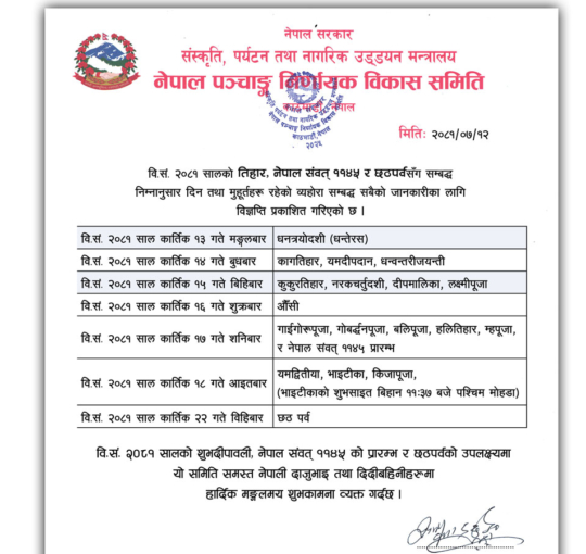 १७ गते शनिबार गाईगोरु पूजा, गोवर्द्धन पूजा, बली पूजा, हलीतिहार, म्हपूजा र नेपाल संवत् ११४५ प्रारम्भ पनि परेको छ । यसैगरी कार्तिक २२ गते बिहीबार छठ पर्व परेको पनि समितिले जनाएको छ ।