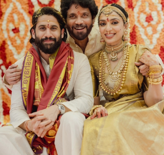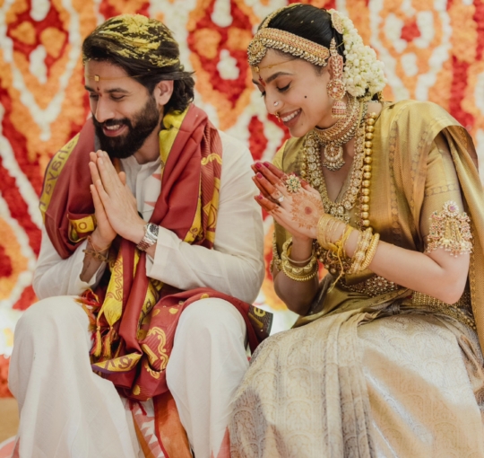 तस्वीरमा शोभिता सुनको एम्ब्रोइडरी–कञ्जीवरम रेशमी साडी र सुनका गहनामा आकर्षक देखिएकी छिन् । चैतन्य सेतो कुर्ता र धोतीमा देखिएका छन् ।