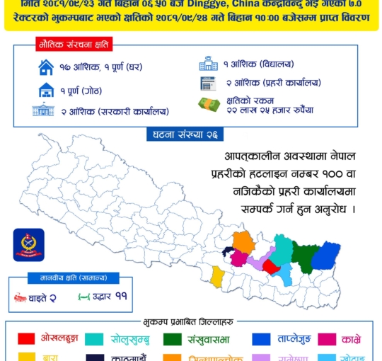 बुधबार बिहान १० बजेसम्मको सूचना अनुसार नेपालमा १७ घर आंशिक तथा एक घर पूर्णरूपमा क्षतिग्रस्त भएको नेपाल प्रहरीले जनाएको छ । यस्तै, एक गोठ पूर्ण रूपमा तथा दुई वटा सरकारी कार्यालयमा आंशिक क्षति पुगेको प्रहरीले जनाएको छ ।